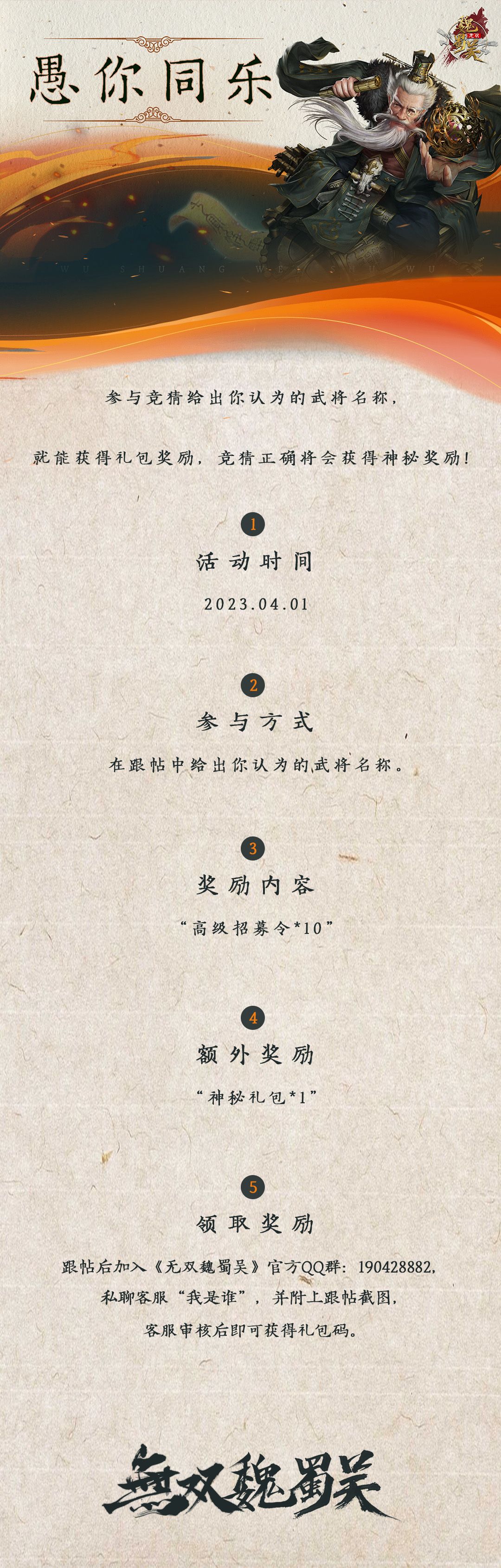 领取奖励:跟帖后加入《无双魏蜀吴》官方QQ群:190428882,私聊客服“我是谁”,并附上跟帖截图,客服审核后即可获得礼包码。