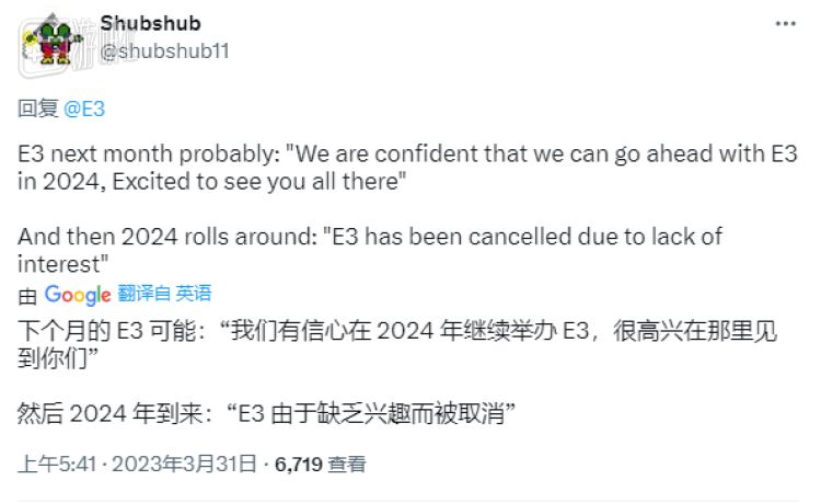 ReedPop和ESA表达了继续在“未来的E3活动”上合作的意愿,但明年的E3还能不能办起来,只有到了明年才知道。已经有玩家回复E3官推,预言2024年的E3: