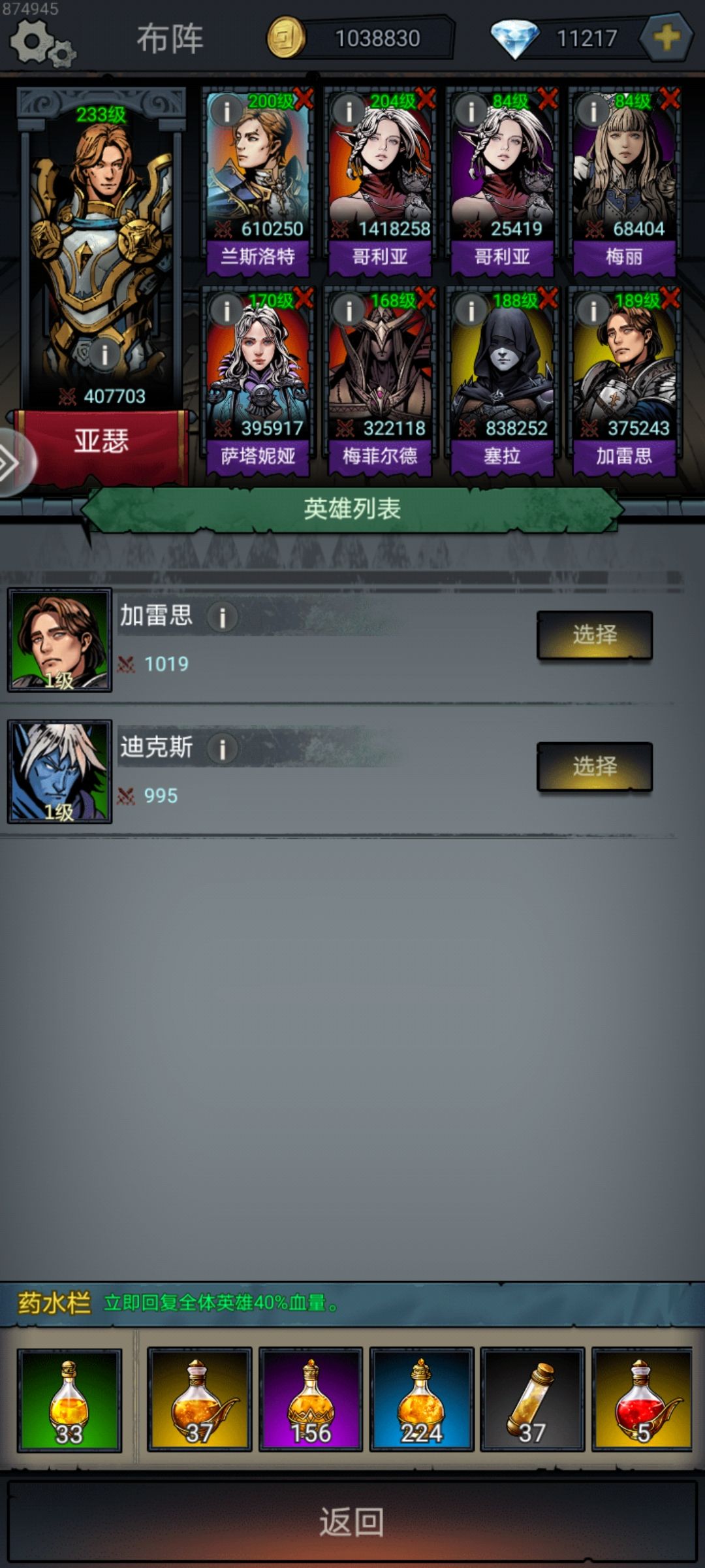 总结,每天刷的钻控制住,养老游戏,最好每天别把钻花完,每天结余一点留着招募双红佣兵,套装也不用急,真的是搞到一套红装就可以一直用了,毕竟可以升等级,当然等级肯定高点起点高,之前刚玩不知道。还有就是精魄全部升亚瑟,没必要给佣兵,等级加的属性跟没有一样,而亚瑟等级关乎着开箱子开书出的道具等级,以及最重要的战阵前线三红部件等级。上阵八人其实没资源养八人,而且也没足够好的佣兵养,我只养了三个(一直想要个单体的双红刺客,刺客技能加成系数太高了,歌莉娅打BOSS有点吃力,控制住打到时间结束或者没蓝了也没办法结束比赛)其他人挂着隔几天就重置把绑定精魄给主养的就完事了不过该说不说,数值系统确实离谱,怪的曲线,城堡贸易商收益,技能提升要的金币,全是槽点。