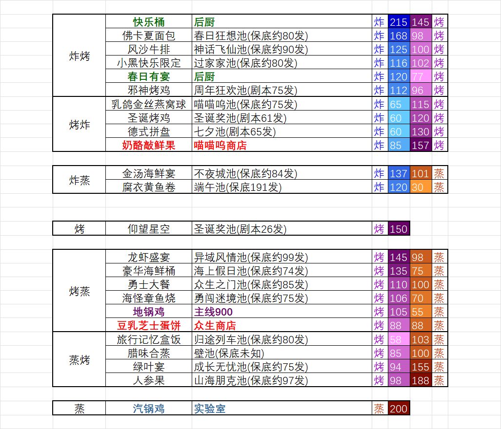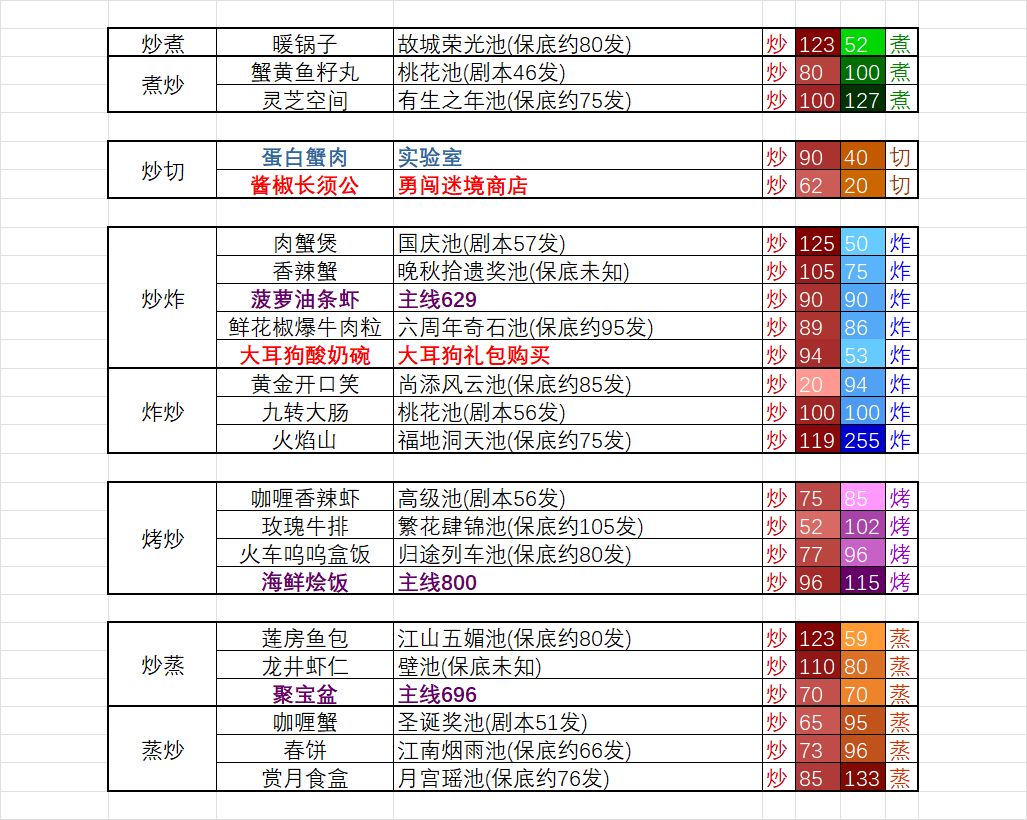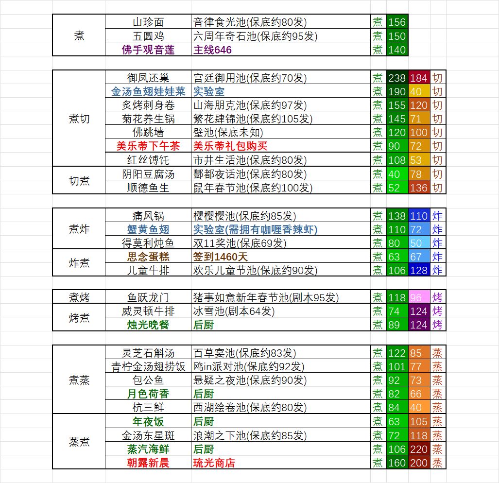 这个表格的不足:如果拥有的菜谱比较少,无法直接从这张表得出修炼方案。以及配色的问题,因为游戏内切和蒸的颜色比较接近,我也没找到一个比较好区分的颜色,以及整张表格内容分布和颜色的安排(因为太晚了,没有把内容汇总到一张图里,我的问题)。