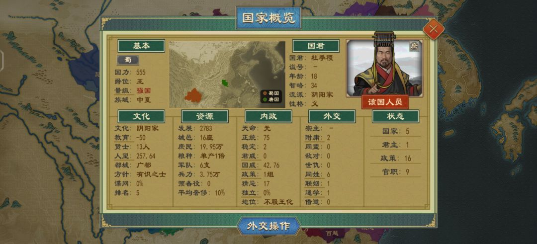 骚乱:受到文化,人口,以及赋税政策影响,过高的骚乱会导致税收减少,骚乱大于30获得"人心惶惶"debuff,可以通过【诛乱】或者开启【免税清空骚乱】来减少骚乱