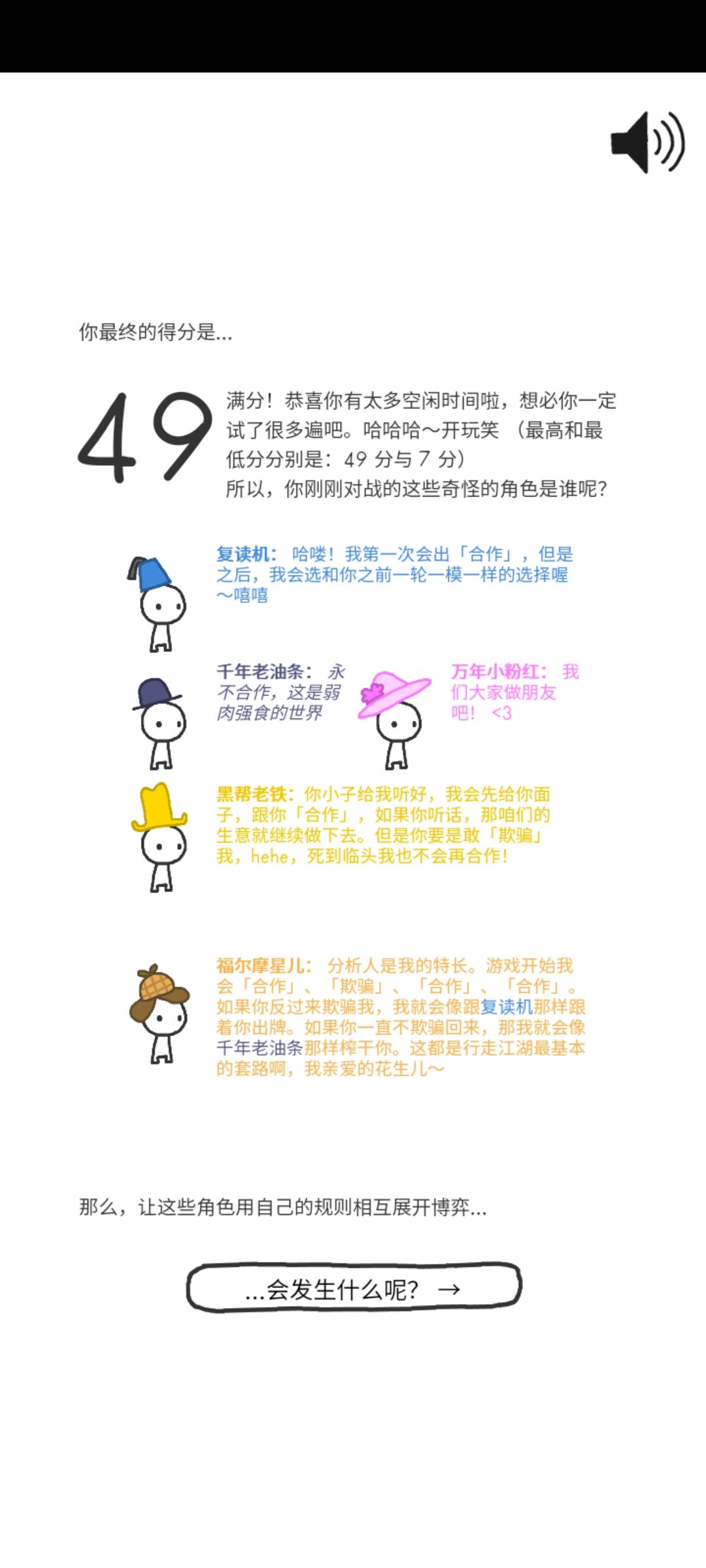 49分拿到了,在第一个复读机那儿,前四局合作最后一局骗,得11分