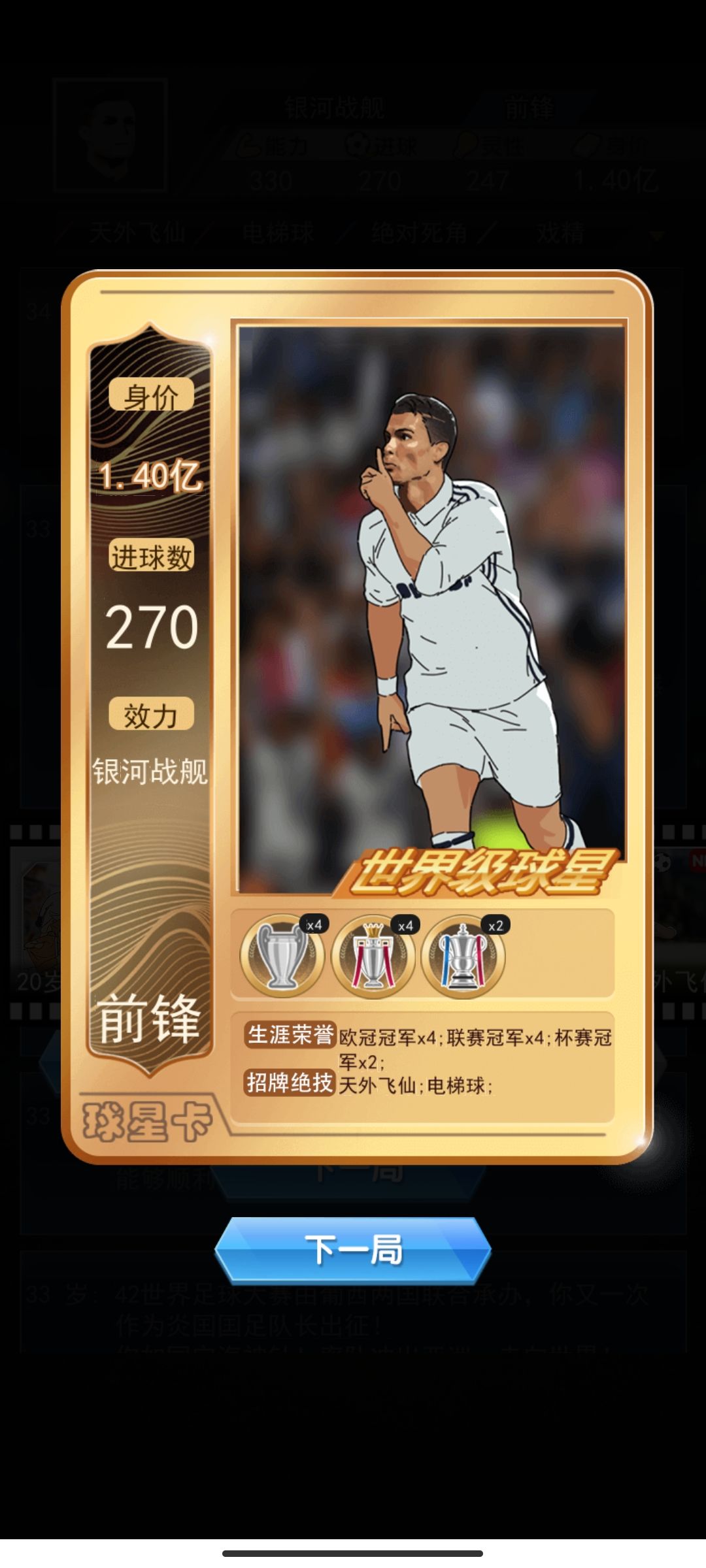 3.希望制作组日后能改进一下各种天赋,比如说钻石和强壮有这两个天赋可以延长游戏时间现在的球员34岁以后其实还在踢。各种天赋加俱乐部可以出奇特的特技比如说香蕉球加直挂死角加皇马或红魔可以出圆月弯刀,外星人加桑巴舞加皇马可以出钟摆过人。毕竟测试了很久我感觉世界杯真的看脸。要是有固定刷特技的方法就可以提高世界杯的概率。
