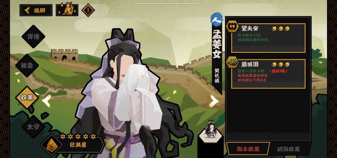 ②二政策也很有趣,目前在水里或者主动配合雨师下雨再使用崩城确实体验感十足。强度方面也很合格。如果做一些失败结局主动降低城防也是十分方便。唯一不足的地方在于城防下降2点太少了。