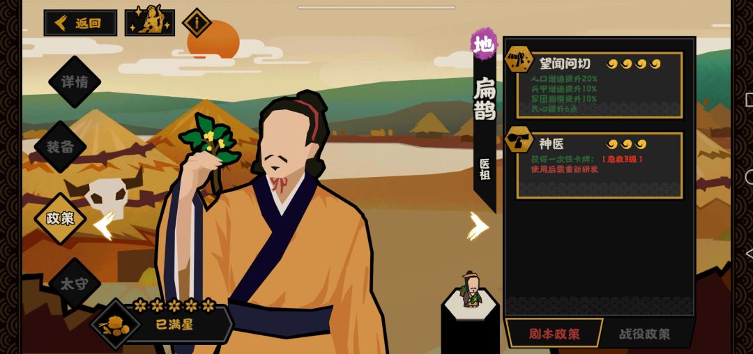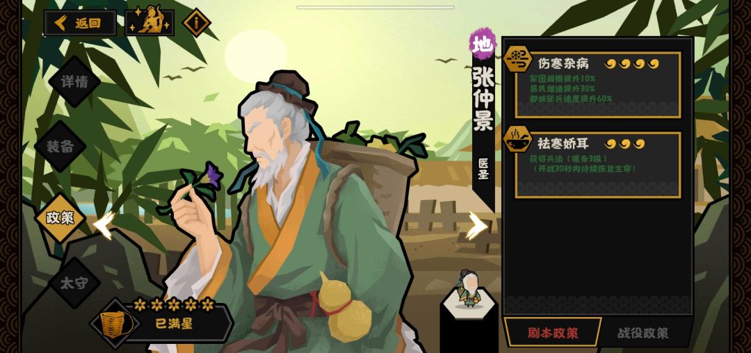 ①张仲景的一政策可以说中规中矩。军团规模不算高,但是提供了额外的居民增速。(这里类比娥皇女英,两个提升数值相加都是40%,所以我说这个政策强度中规中矩。)但是目前唯一的问题在于张仲景的政策一需要三点科技才能施行。