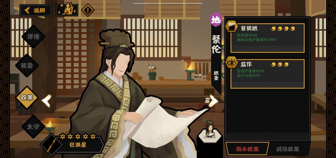 所以建议:蔡伦历史上毕竟改良了造纸术,所以可否把3点文化提升改为1点科技。不然3个士子的消耗确实太亏了。