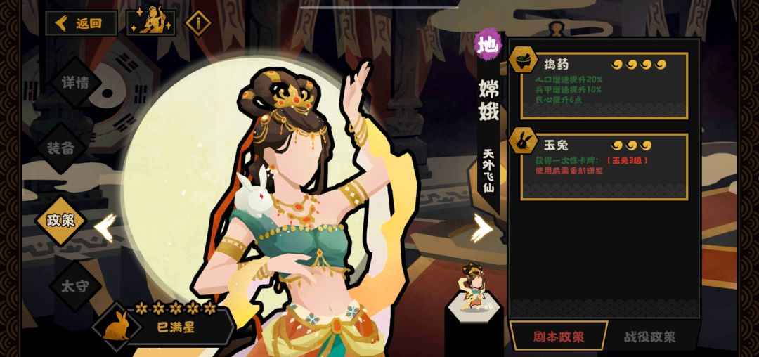 ①民生类特殊政策?就是在官方设定的规律里面吧:军团规模%=人口增长速度%=兵甲增长速度%,目前大部分新地级这两个数值之和应该有40%,但是嫦娥只有30%,额外补充的一次性6点民心提升有些意义不明。