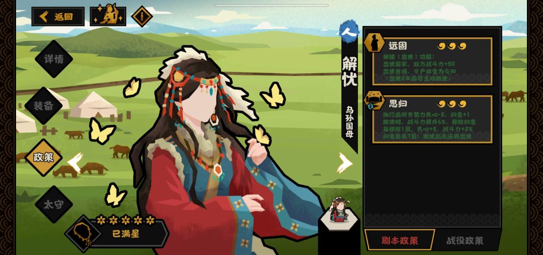 ②解忧的二政策本来应该是一个兼顾中期与后期的挺有意思的政策,因为思归一共可以叠7层,完全施行7次可以降低所有势力35的民心,撤使之后还能获得20%的战力提升。