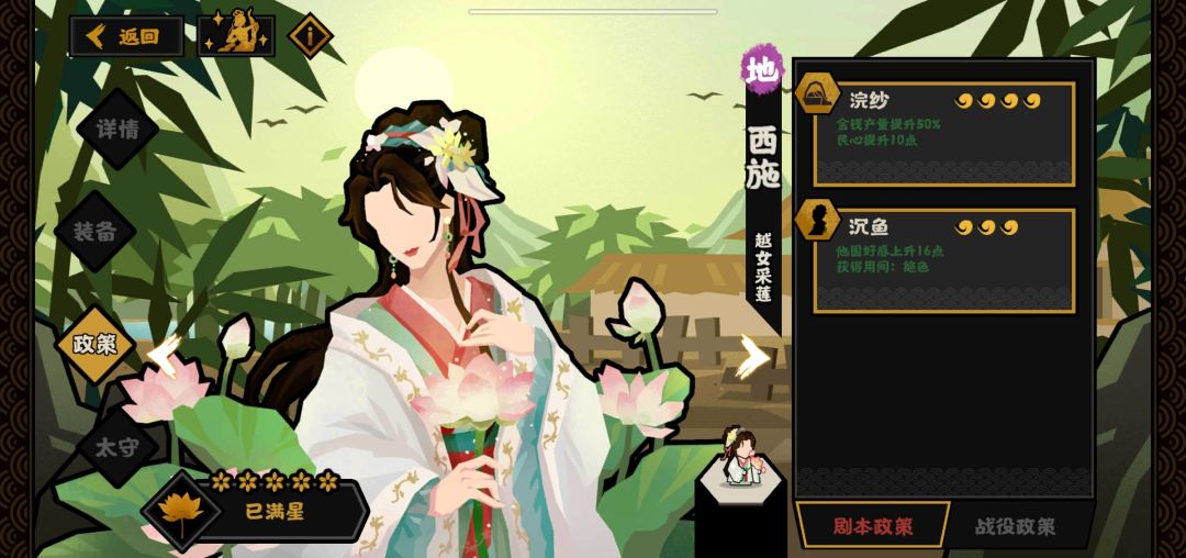 ②二政策算是西施的特色政策了,经过上一次的加强,已经可以在作用单城的时候同时影响该国家整体了。