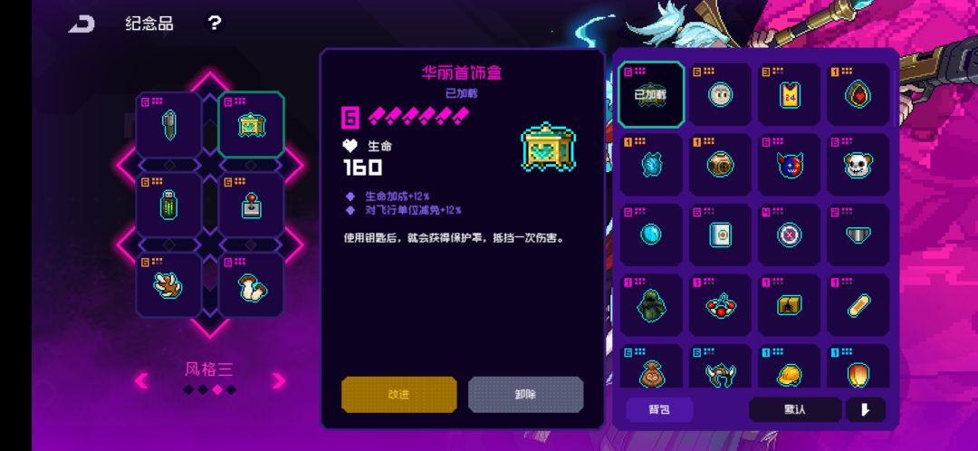 没点击一下手雷按钮,就会自动将钥匙转化为一颗手雷发射出去,利用首饰盒的效果转化为抵挡任何伤害的保护罩,这样你就可以一直无敌下去了。