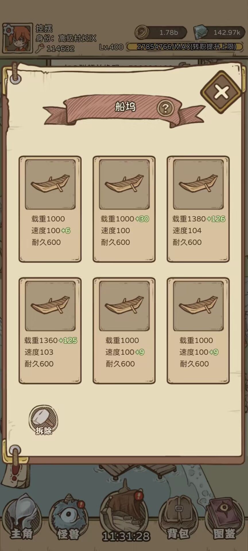 (3)船只一共600点耐久,1分钟扣除1点(剩余1点耐久也能继续开),所以这里有个小技巧,买特产基础时间是4小时(2个2小时),卖东西基础时间是2小时(120点耐久),600耐久是5个120,如果提升1点速度,5个2小时以后还会剩余一点点耐久能多开一次船。