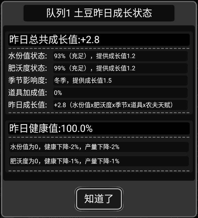 得到公式:成长值=水份值*肥沃度*季节*道具*农夫天赋
