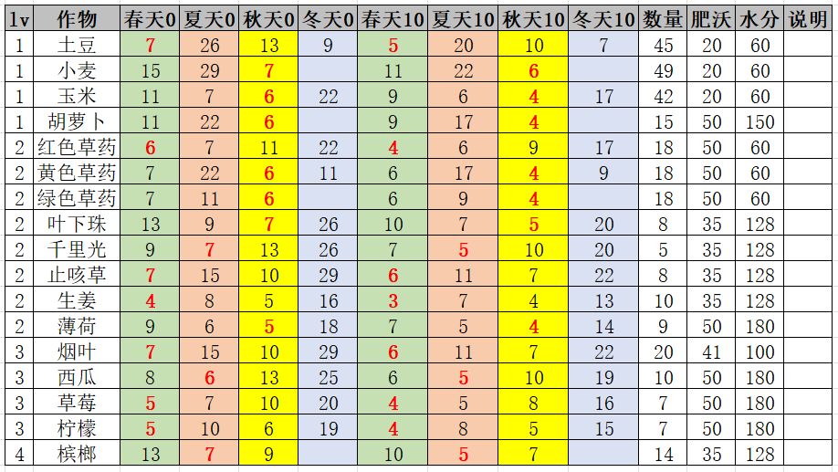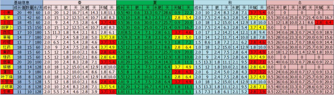 可以给出,不同作物在不同季节,无农夫天赋,基础成长值的表