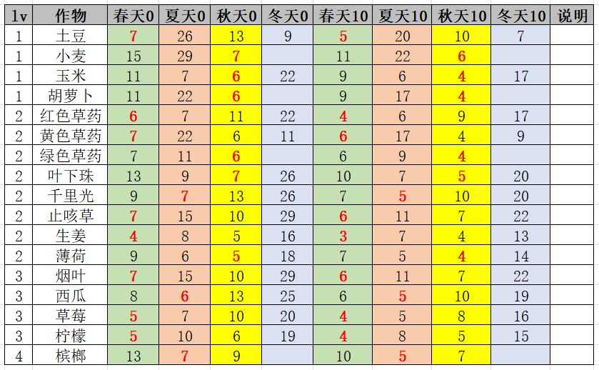 主要是给出,0农夫天赋和满农夫天赋,不同作物在不同季节的成长天数