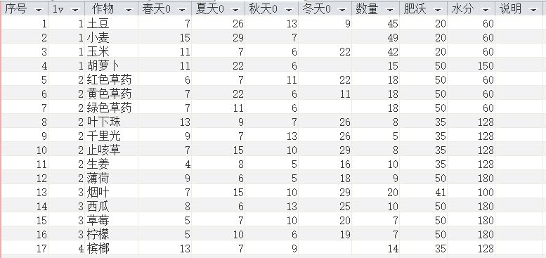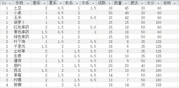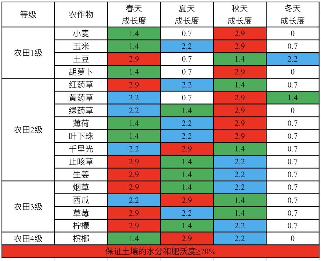 其中,春天0等,指不同作物在不同季节,农夫天赋0级时的生长天数