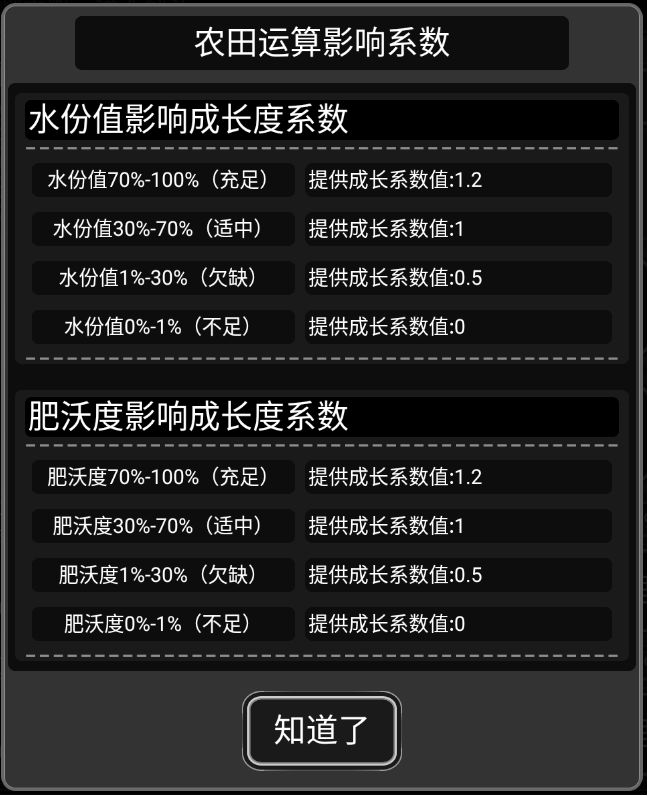 得到数据,水份值充足提供成长系数1.2,肥沃度充足提供成长系数1.2