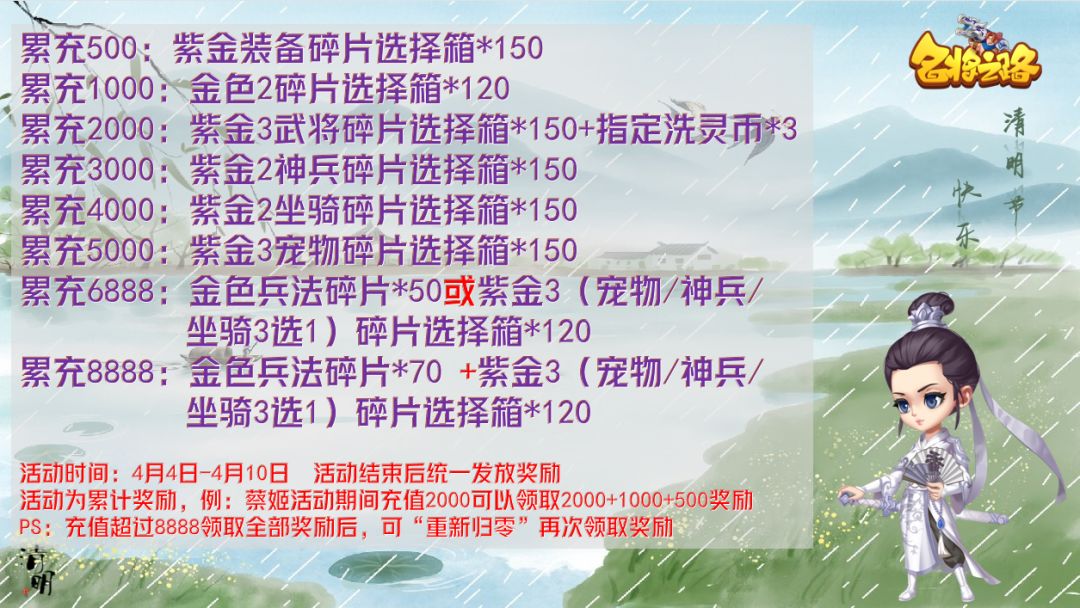 【活动说明】在活动时间内(4月4日-4月10日)累计充值达到金额可领取对应档位的大礼包。活动为累充奖励,充值高档位包含以上全部低档位奖励(例:活动期间累计充值2000元可以领取奖励合计为2000+1000+500)
