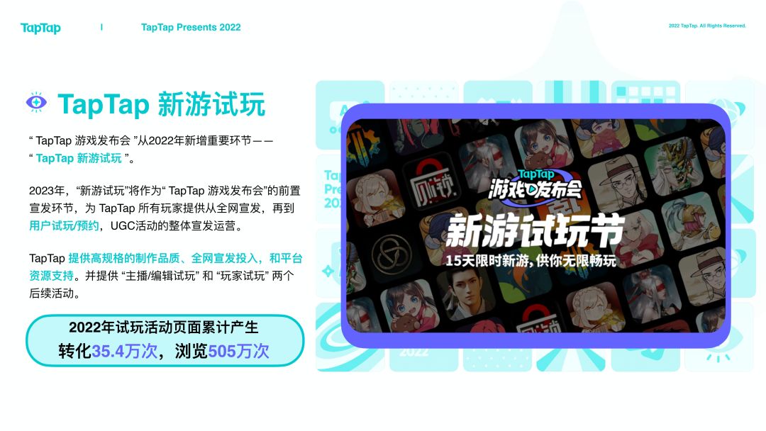 活动介绍:2023游戏发布会—新游试玩,是 TapTap 为全体玩家打造为期多天的,新游限时试玩活动。活动期间会有特定的页面进行曝光,开发者可以通过相关页面分享新游试玩,收集玩家反馈,也可以通过试玩及各式活动为即将上线的游戏进行预热。