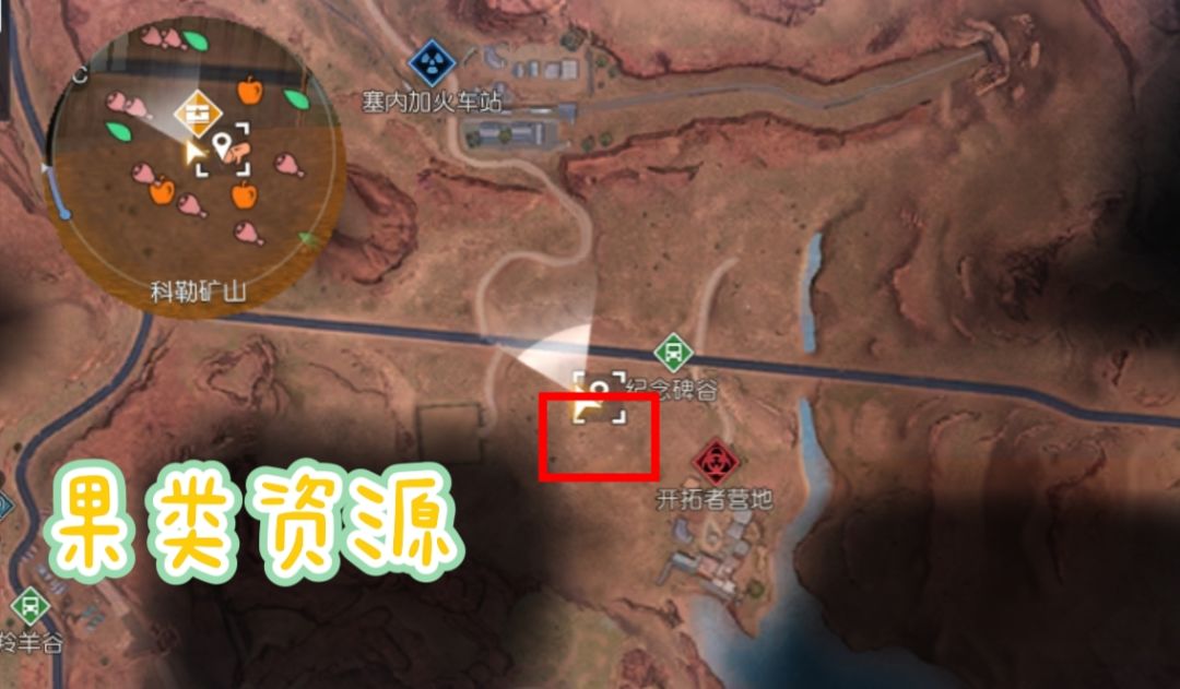 ①传送到69号荒漠公路,走到如图所示位置,这里有两处的矿山石类资源密集感染者少可供玩家迅速采集。如果传送到塞内加火车站如图所示的东北方采集矿石,会发现附近也有大量树木可供砍伐,可快速获取两种资源