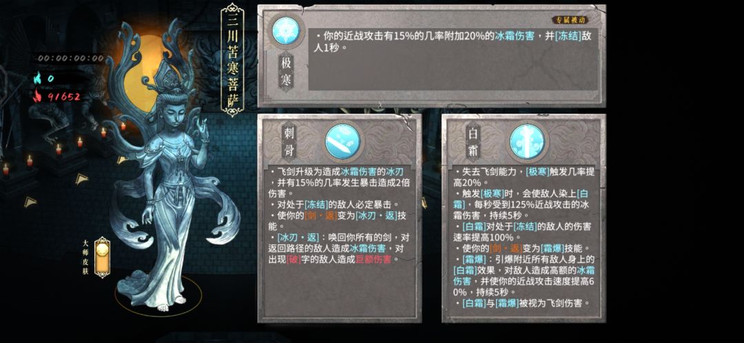 流派选择刺骨,即冰1,飞剑变为冰刃,收剑时对路径上的敌人也会造成大量冰霜伤害,对冻结的敌人百分百暴击,几次体验下来其实可以完全舍弃近战而专精飞剑,伤害也很高。