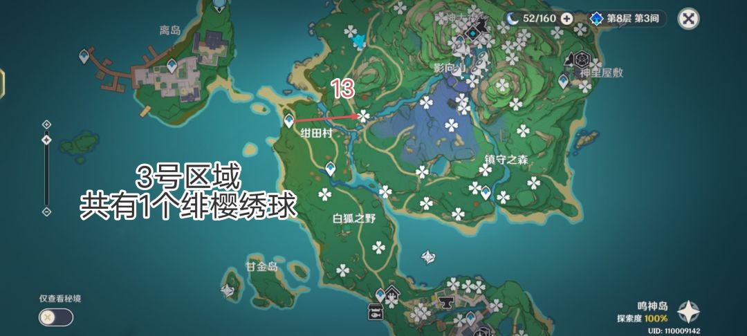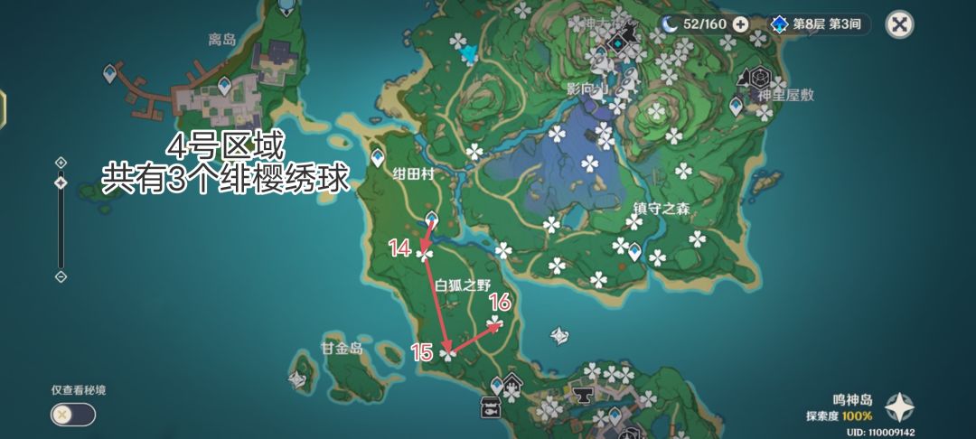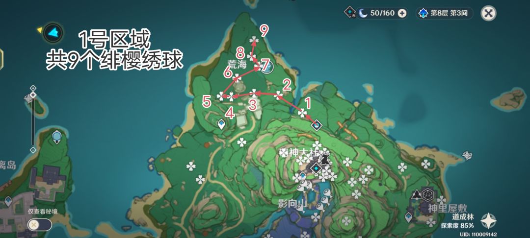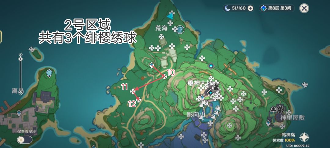 8号区域的绯樱绣球主要集中于鸣神大社附近,总计36个。
