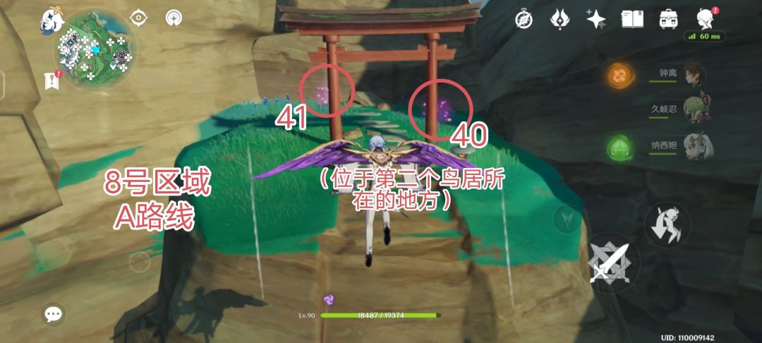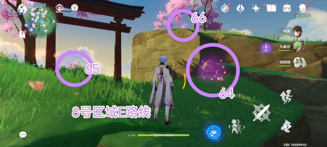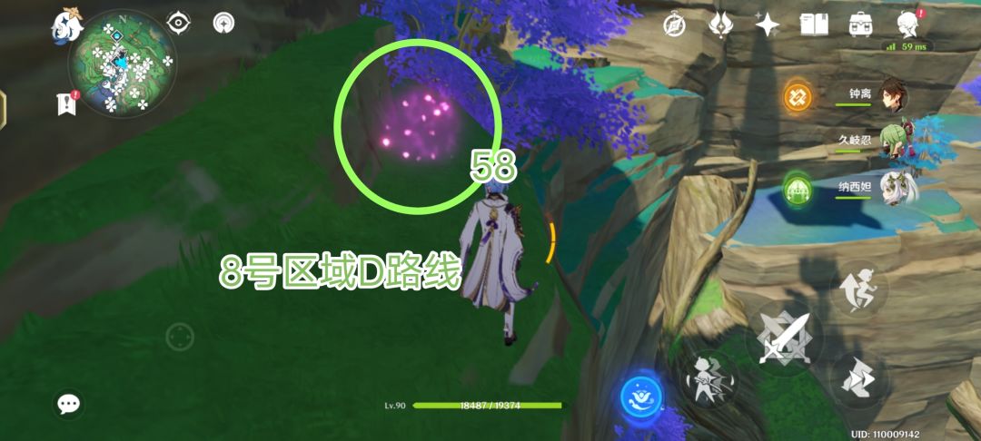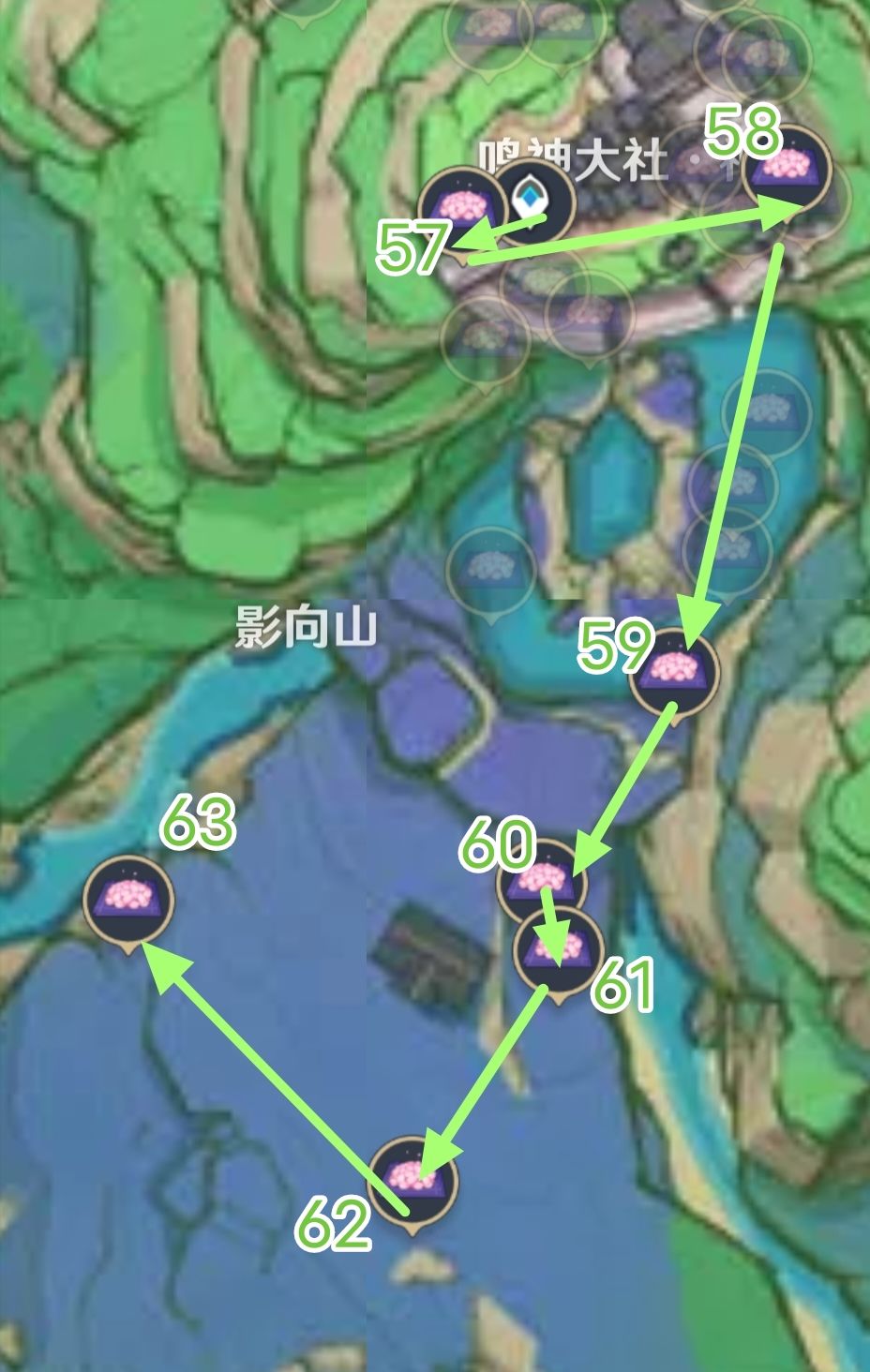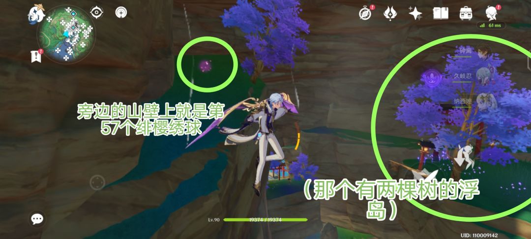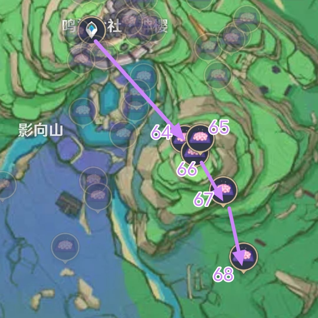 采集完第58个绯樱绣球后,接下来的几个并没有那么难找,都在地面上,根据我图中的标记前往即可。