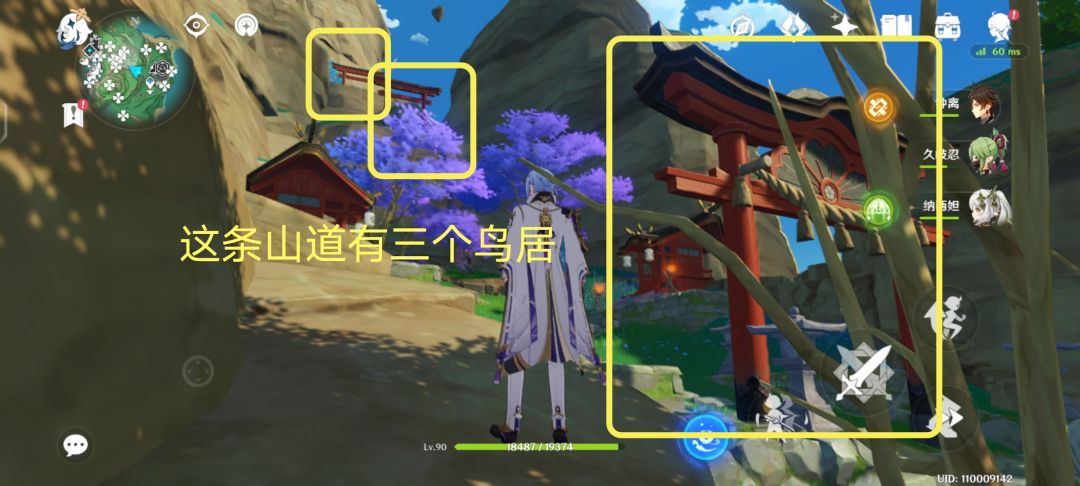 从传送点出发,沿着山道往上走,可以看到有3个鸟居,第40、41个绯樱绣球便是位于第二个鸟居。