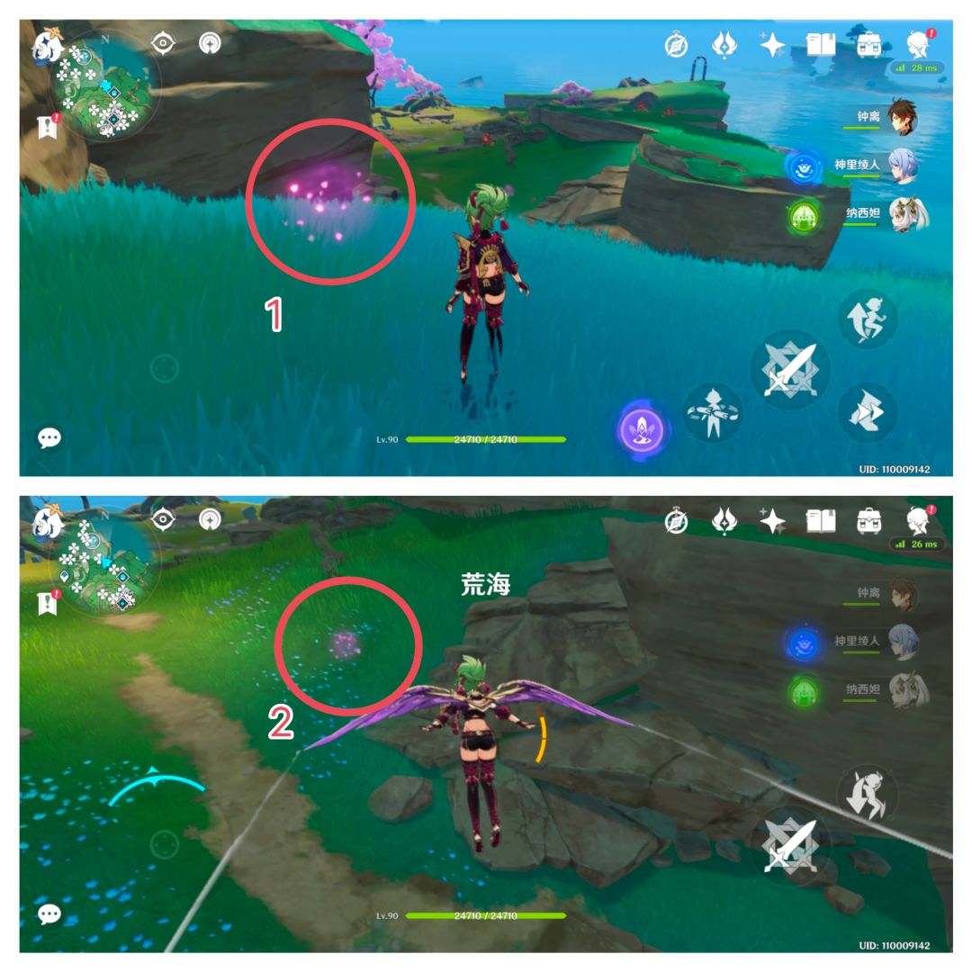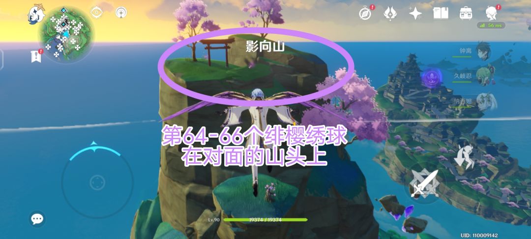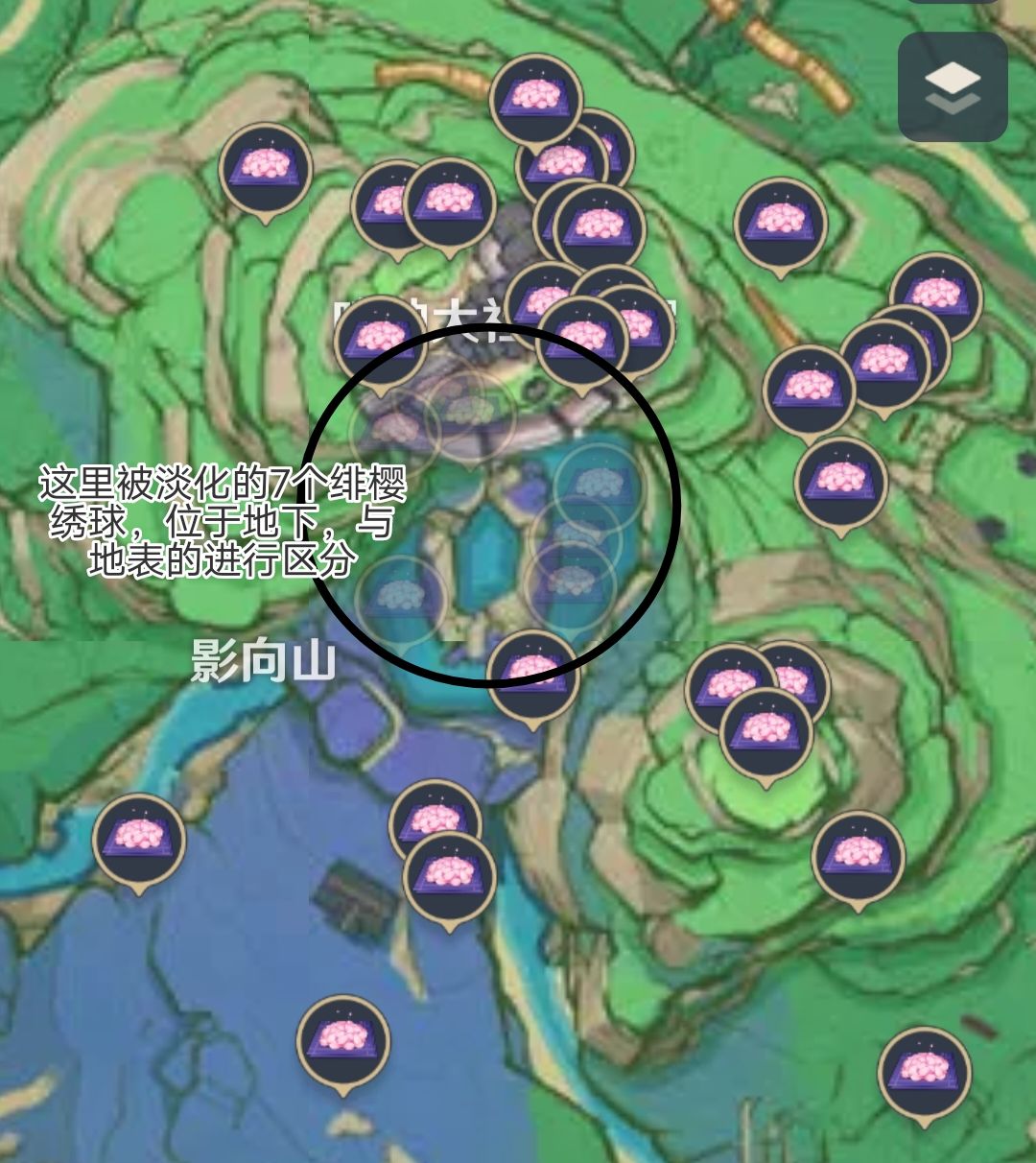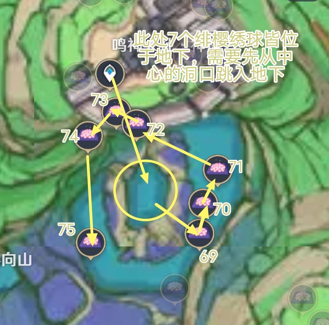 此处的7个绯樱绣球皆位于影向山的地下,需要先从洞口(图中的黄圈)跳入地下才可以采集。