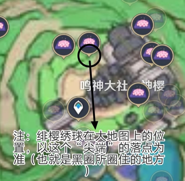 注:绯樱绣球在米游社大地图上的位置,以其下方的“尖端”为主,也就是下图中黑圈所圈住的地方。