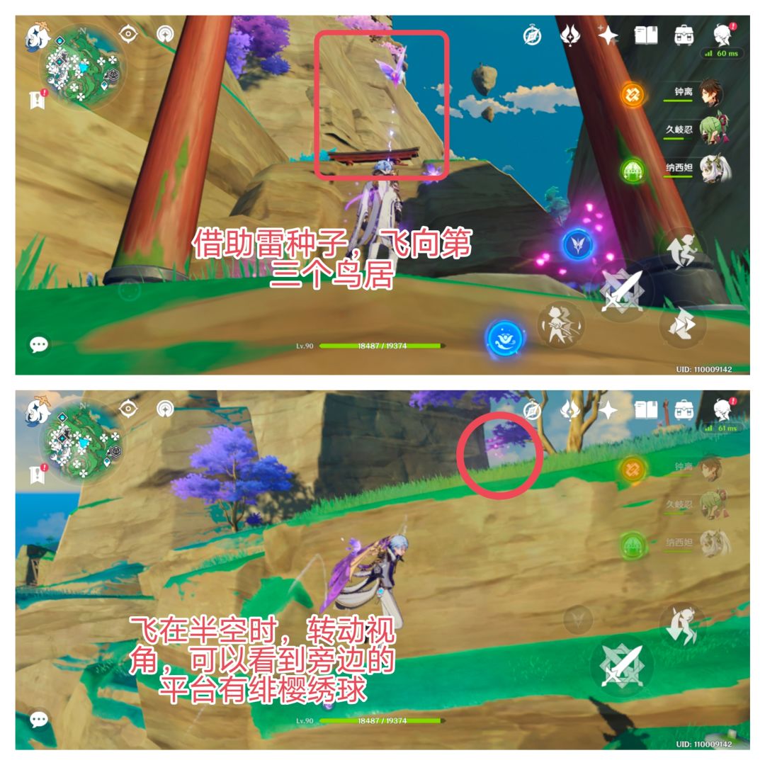 接着借助雷种子飞到第三个鸟居的半空,此时转动视角,可以看见绯樱绣球在两边的平台上。