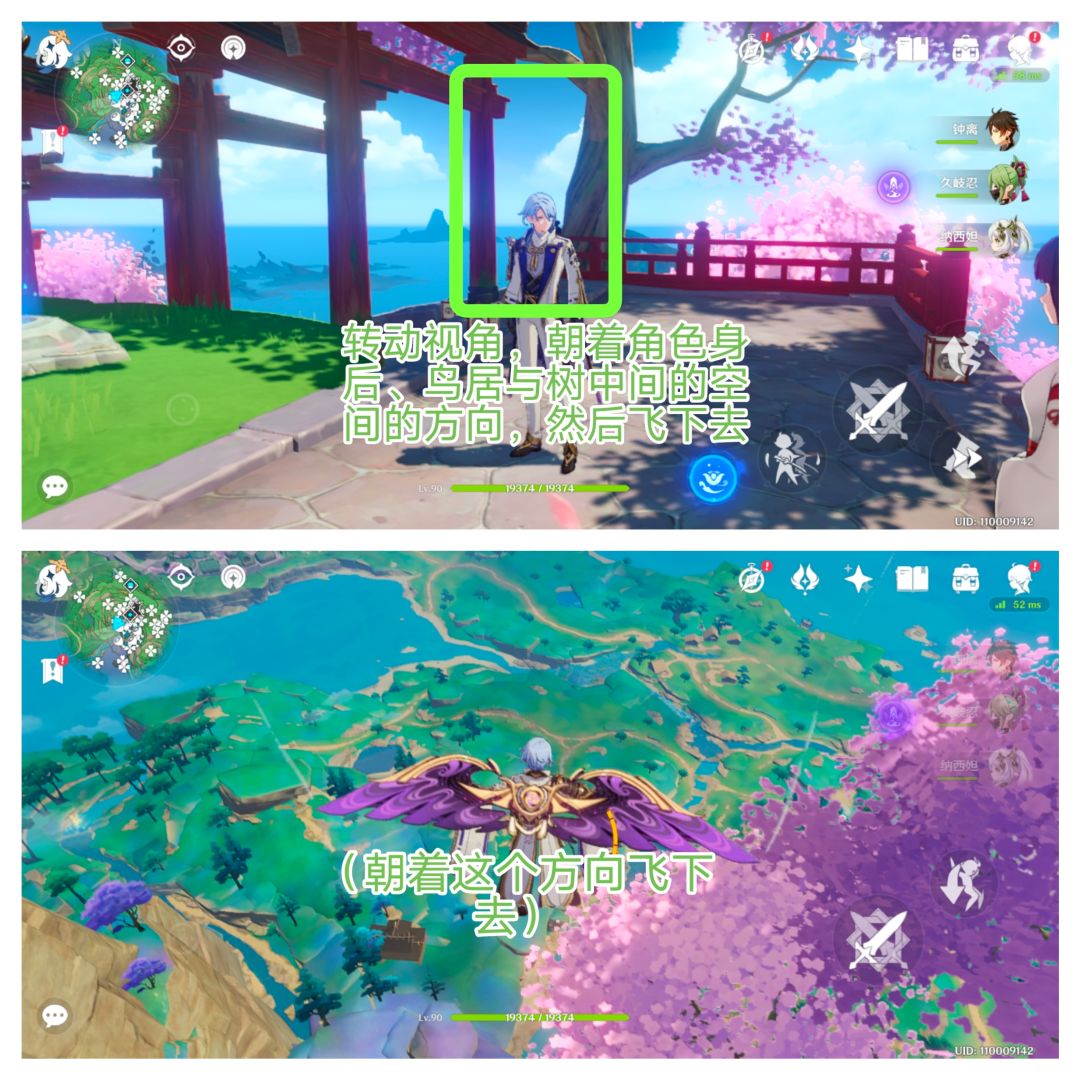 首先,在传送至传送点后,转动视角,朝着角色身后的、鸟居与树中间那块空间的方向,然后飞下去。