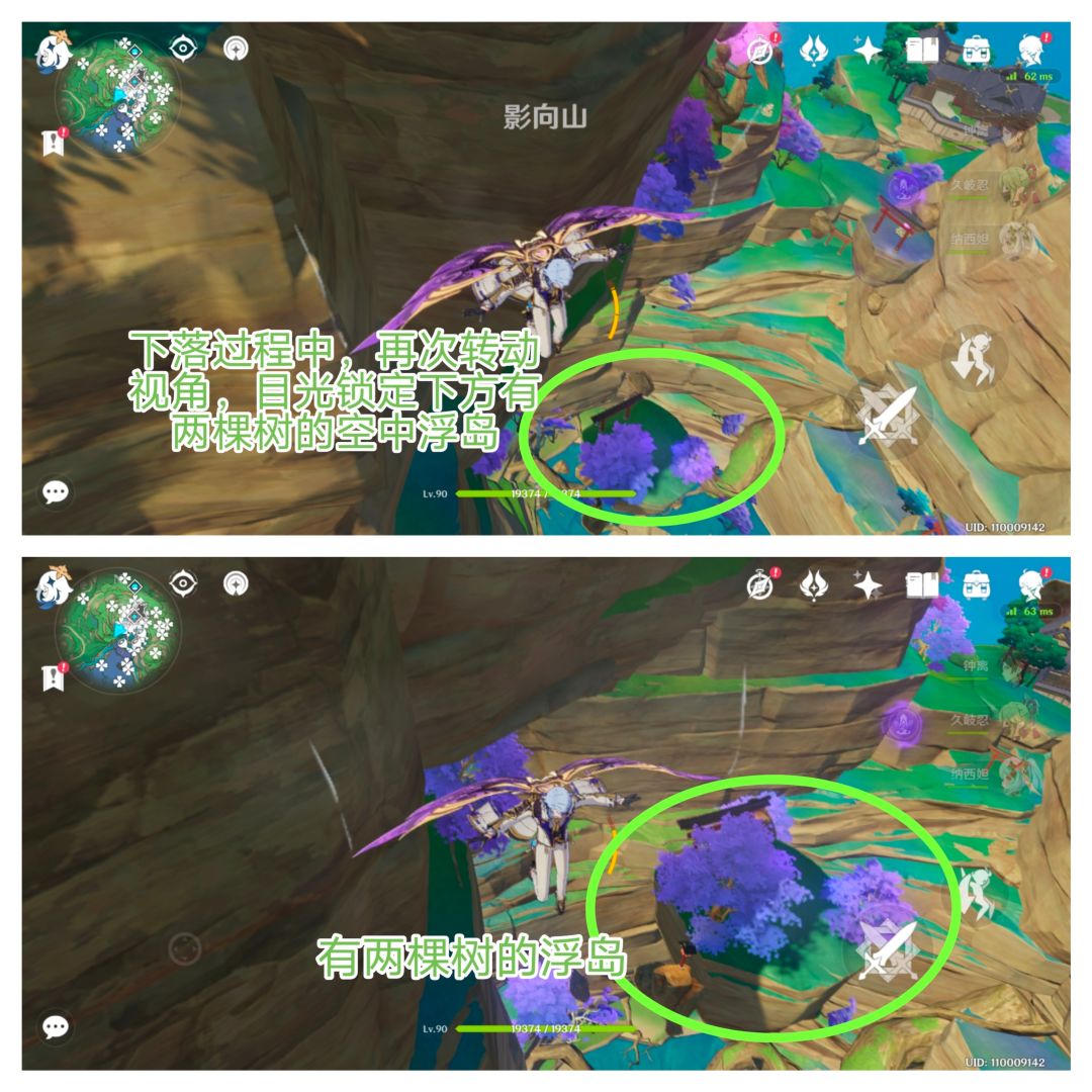 下落过程中再次转动视角,目光锁定下方的、有两棵树的空中浮岛。
