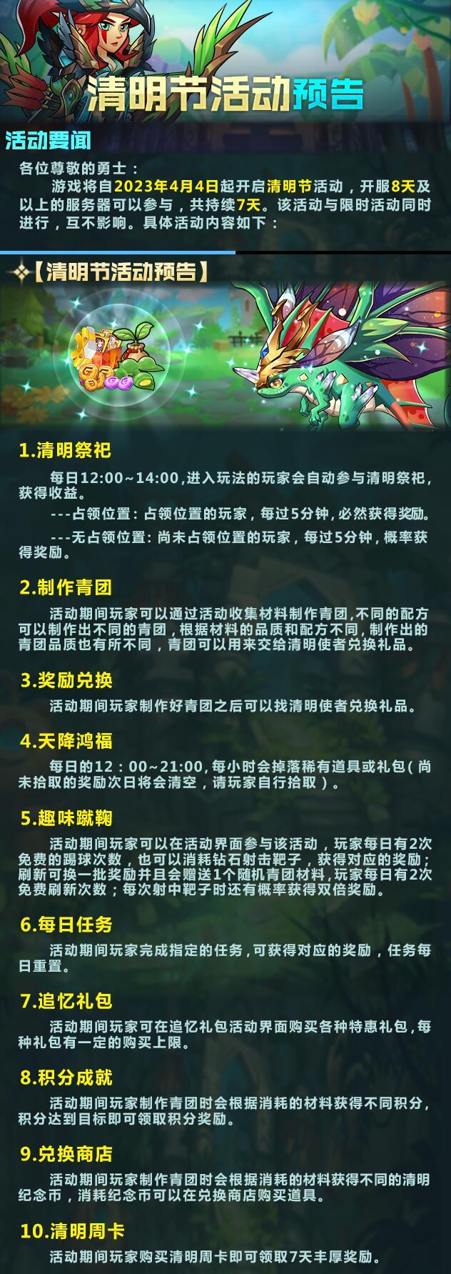【清明节活动预告】游戏将自2023年4月4日起开启清明节活动,开服8天及以上的服务器可以参与,共持续7天。该活动与限时活动同时进行,互不影响。具体活动内容如下: