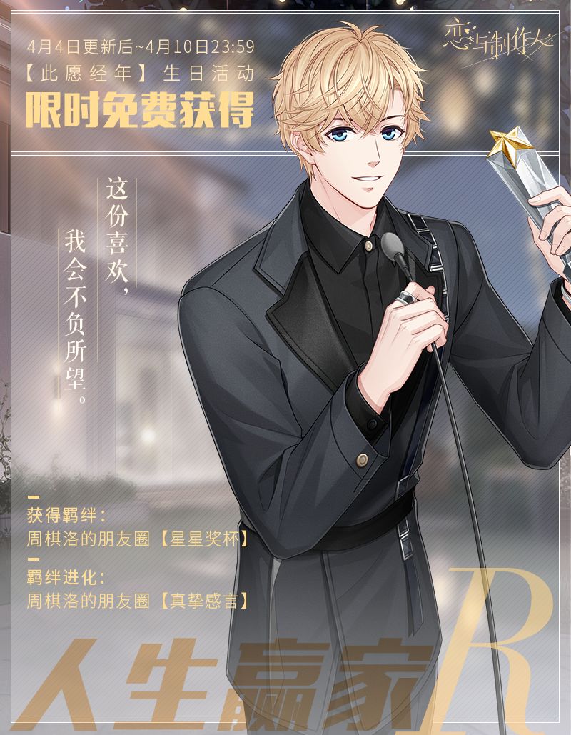 4月9日0:00~4月10日23:59期间,可触发他的特别庆生互动剧情。