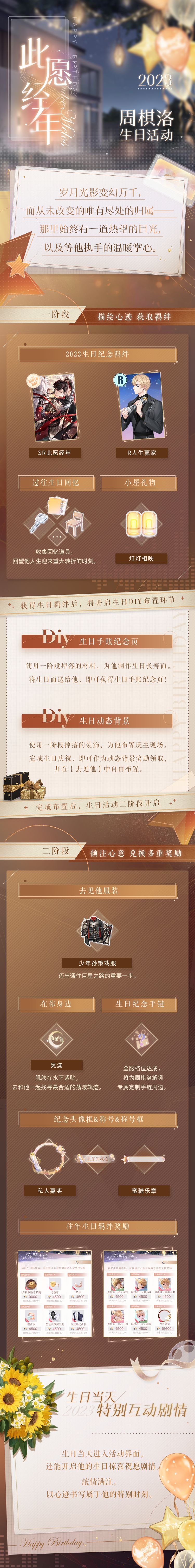 4.收集齐六段故事的回忆道具后,即可领取周棋洛生日纪念羁绊【周棋洛·此愿经年】。