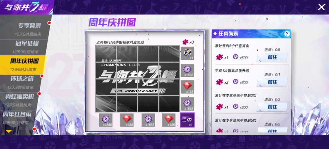完成专属任务,每行每列均有丰厚奖励,点亮全图更可获得周年庆限定名片,机会难得,赶快行动吧!