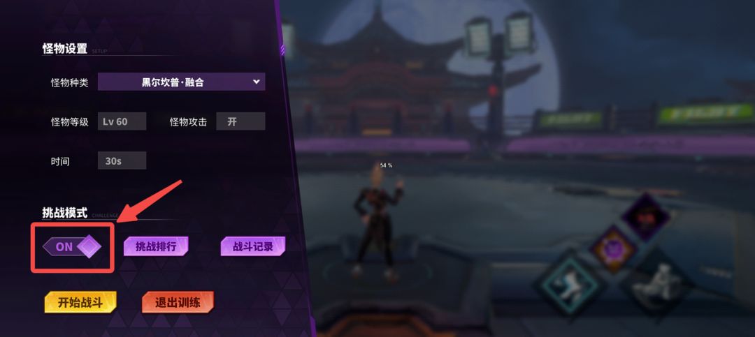 5、在弹出的怪物设置界面中,将【挑战模式】开关切换到【ON】状态,然后点击【开始战斗】按钮;