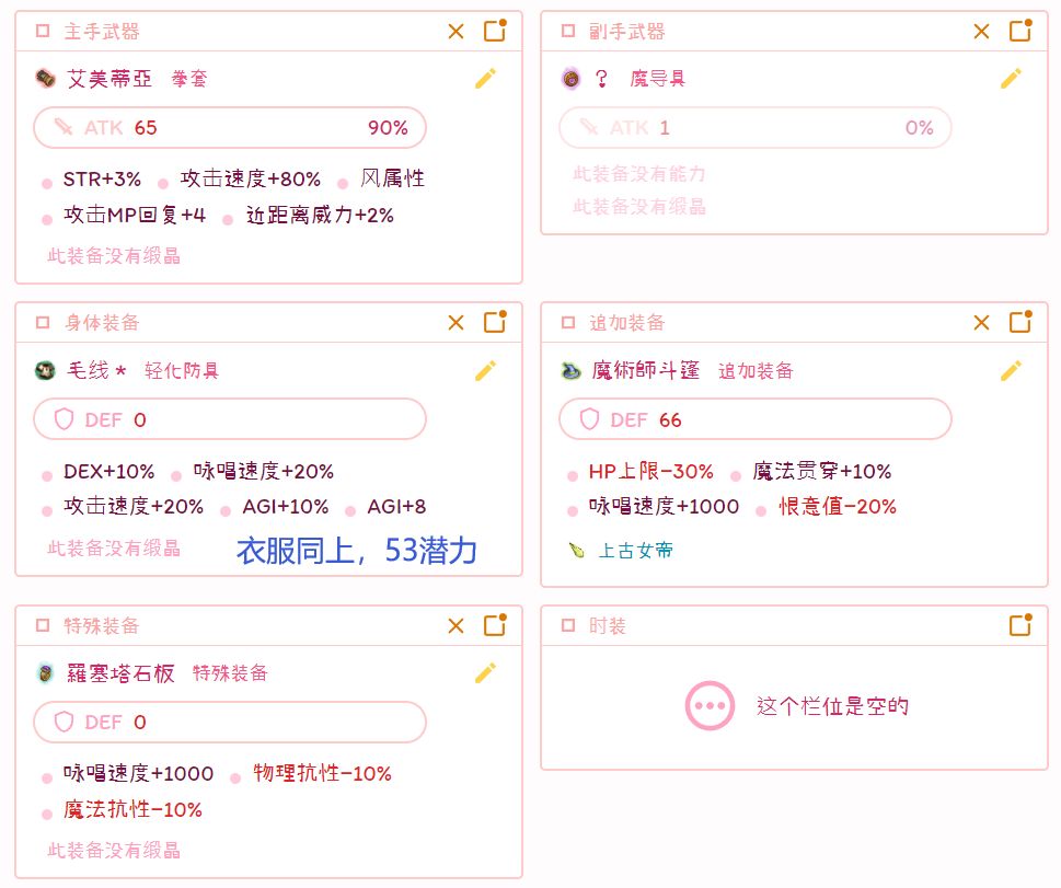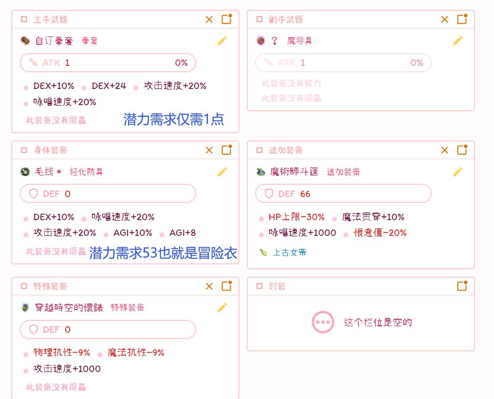 tips:魔术师斗篷可以使用750咏速版在其他王石位置补充咏速(比如武器死灵妖兔2、皮思泰乌鱼,衣服病死菇、魔人、邦卫魔像,通用毛咕噜等)