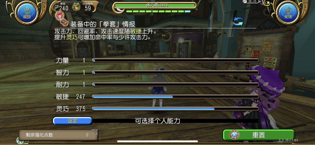 拳职业的基础攻速计算是120+4.6倍敏捷+0.1倍灵巧+角色等级;基础咏唱速度计算是2.94倍灵巧+1.16倍敏捷+角色等级。显而易见,敏捷的攻速收益是极高的,所以高攻速更易达成,我们为了到达到高咏速就需要点更高的灵巧。于是选择了主灵副敏的加点:375灵巧,247敏捷。