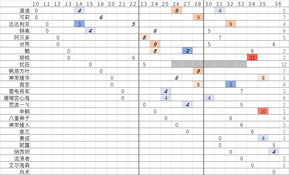 *数字代表距离上次复刻的版本数,“0”即新角色。3.7版本之前,该数值平均值为6.1。