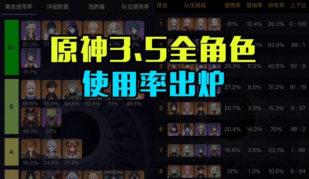 随着4月1日原神3.5版本的深渊重置,小助手也在4月1日开启了3.5深渊的统计。今天Z哥就来带大家看看这期的深渊角色使用率如何,以及对比上期深渊到底有哪些变化。在此之前需要给大家解释一下,角色使用率 = 使用该角色在12层登场的玩家数量 ÷ 持有该角色的玩家数量。角色使用率使用率越高,就说明持有该角色的这部分玩家,更愿意使用这个角色去打深渊。而角色使用率使用率越低,则说明持有该角色的玩家,更不愿意去使用这个角色去打深渊。需要说明的是,角色使用率主要是为了方便玩家参考,帮助玩家做出更合理的配队选择,而不是为了拉踩角色。经玩家反馈,本期存在艾尔海森和优菈部分识别不到的问题,目前已经重新校对并且更新数据。话不多说,直接上图:角色使用率: