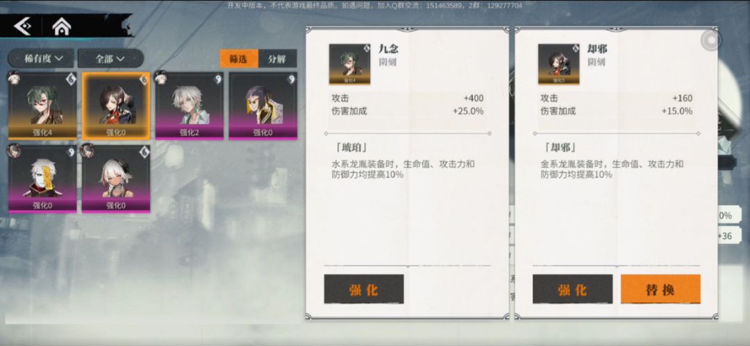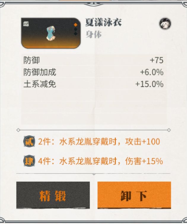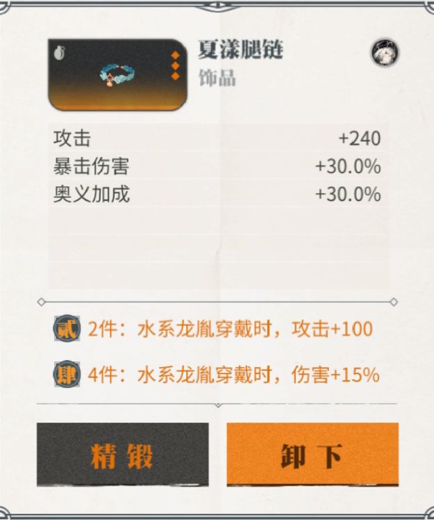 每个龙胤可以装备四个装备,分别是头部、身体、饰品、足部。同时分三个等级,分别是橙装、紫装、蓝装,蓝装是最低品质,只有两个属性,紫装和橙装都有三条属性,并且有元素套装效果,如水系龙胤穿戴两件水系装备可以增加100攻击,穿戴四件水系装备可以增加15%伤害。所以不同的龙胤要搭配对应元素的装备才能发挥装备更大的加成作用。