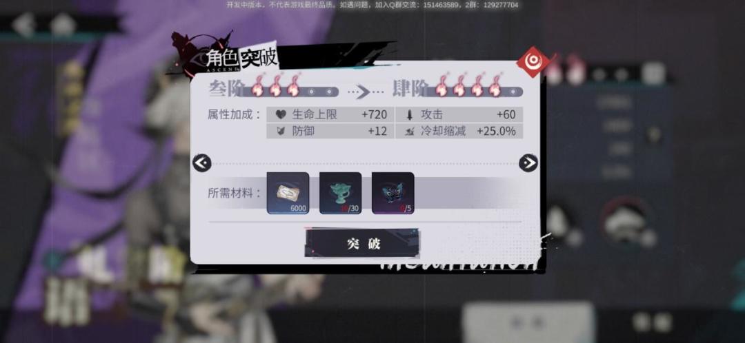 角色每满10级,则需要进行一次突破,突破需要九方币和两种突破材料。