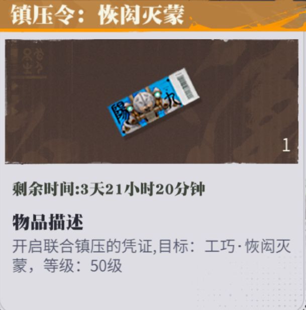 镇压令是联合镇压活动的门票,每个镇压目标所需要的门票都是唯一对应的,还有时间使用限制,获得之后超过时间将无法使用。