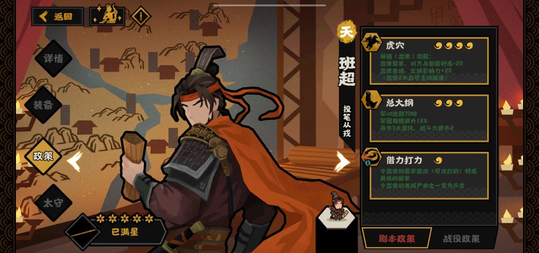 ①、③这两个政策合在一起说吧,班超这两个政策目前来说,主要用与大汉快速达成西域结局和用来做特定的失败结局成就。至少我觉得从做成就(例如摘星台自焚)的角度来说比比陈平那个挑拨来的舒服。