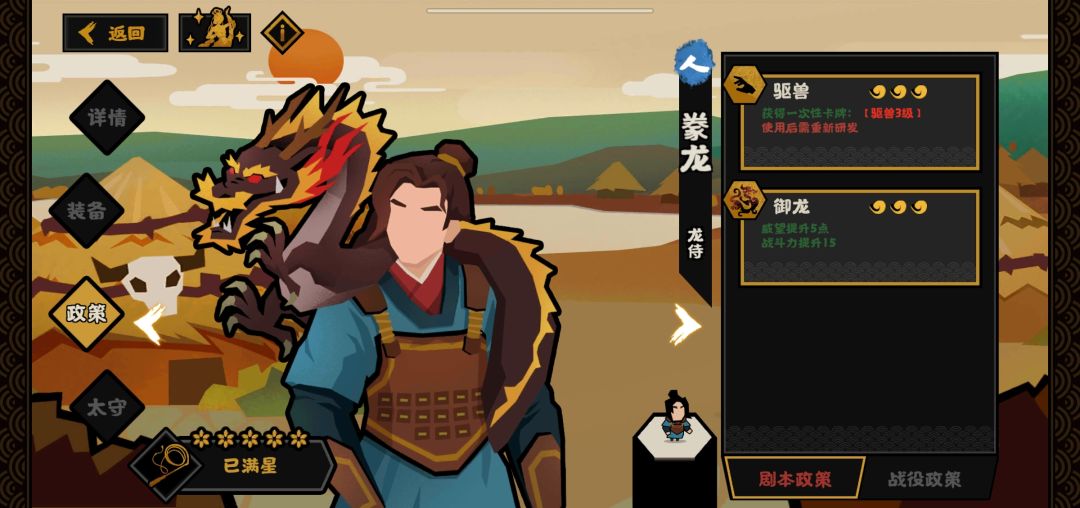 ②御龙这个政策目前来看没有什么特色,无非是提供了5点威望和15的战斗力。在政治类名臣中其实算不上什么强力效果。