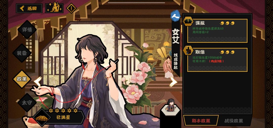 所以建议要不然将谍报的情报度直接改成100用于配合杨戬和自身的启动,要不然将用间等级提高一些配合其他用间类名臣。