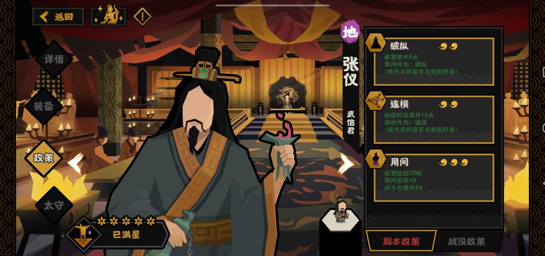 ①、②张仪的一、二政策目前仅仅是让你在大汉之前的时代不需要点具体用间就能获得加强的游说和离间。但是对于后续时代来说就仅仅只是获得加强版用间。