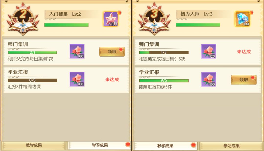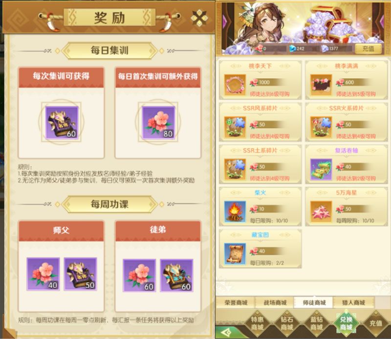 通过完成每周功课和每日集训获得师徒值,可以在师徒商店中换取丰厚奖励。