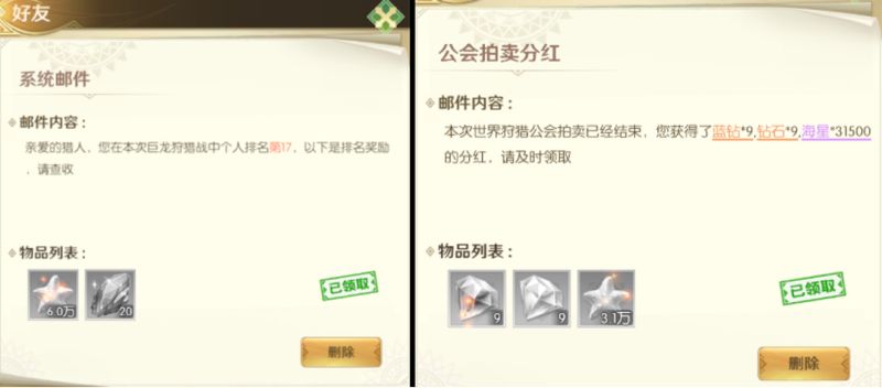 每天参与巨龙狩猎后会按照伤害积分排名发放奖励,排名越高,奖励越多。狩猎结束后会开启公会拍卖,运气好的话还能获得翅膀和结晶等超稀有物品。